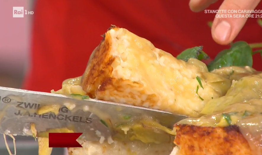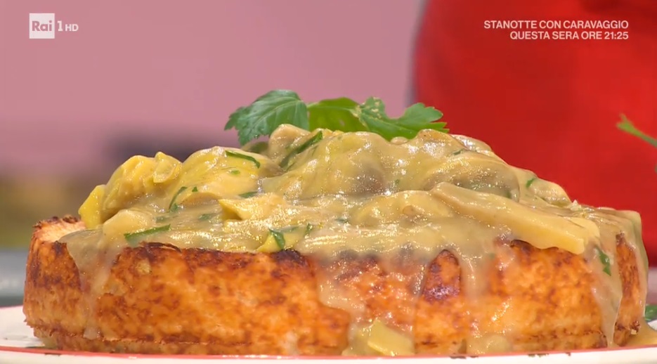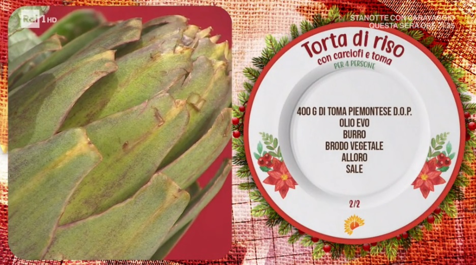 All’interno di una tortiera imburrata da 24 cm, formiamo un primo strato di riso (circa la metà di quello preparato). Disponiamo sopra la toma (o provola) a fette e copriamo con il riso rimasto. Compattiamo con un cucchiaio e livelliamo. Possiamo preparare questa torta il giorno prima e conservarla cruda in frigorifero. Passiamo in forno caldo a 180° per 15 minuti: deve dorare. Serviamo distribuendo sopra i carciofi stufati.