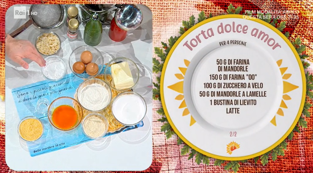 - 200 g burro, 200 g zucchero, 3 tuorli, 3 uova, 85 g fecola di patate, 1 cucchiaio di maraschino, 75 g farina di mais, 50 g farina di mandorle, 150 g farina 00, 100 g zucchero a velo, 50 g mandorle a lamelle, 1 bustina di lievito, latte