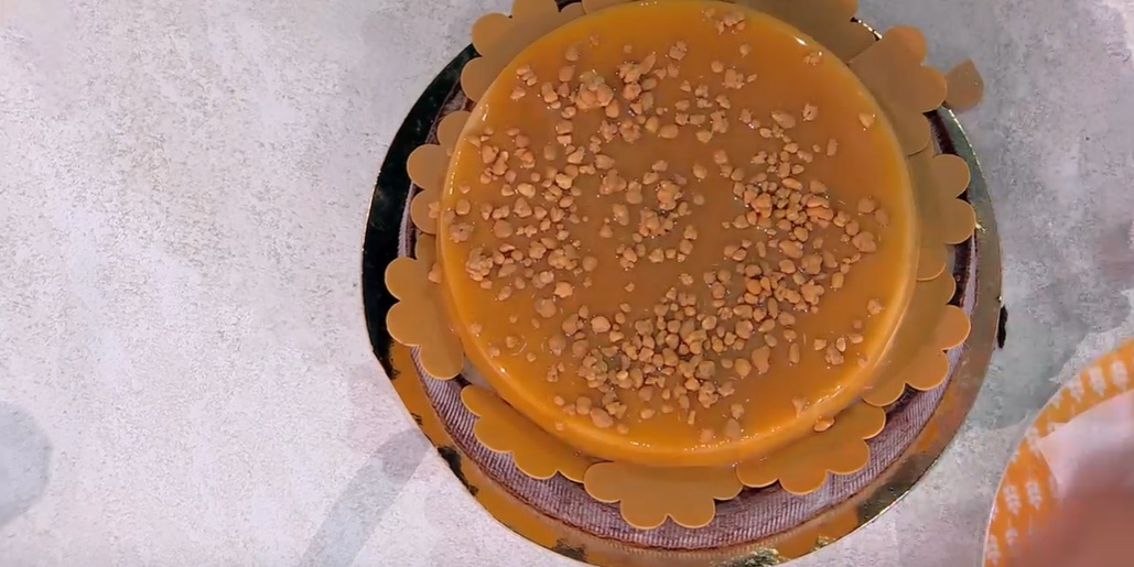 Sformiamo la torta congelata e coliamo sopra la glassa al caramello. Posizioniamo sopra la mousse al caramello congelata e decoriamo con arachidi pralinate e decori.