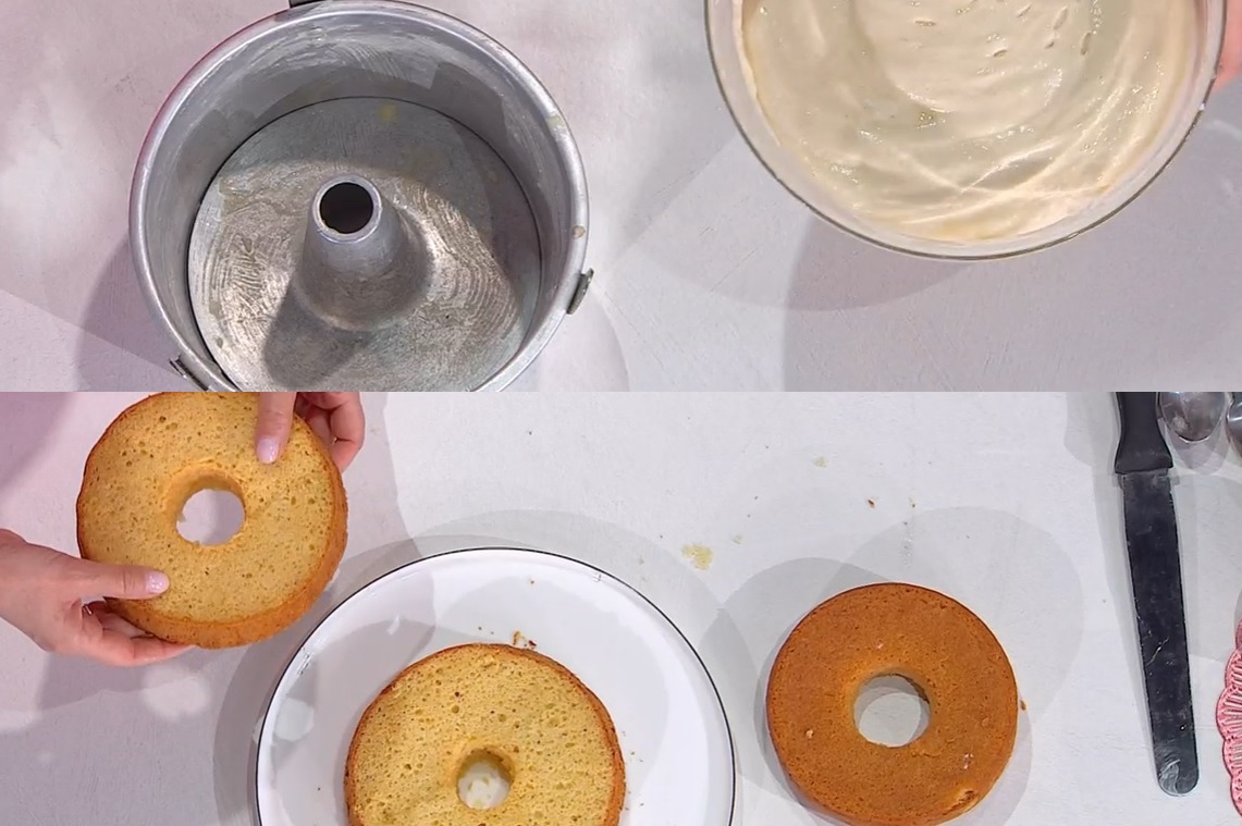 Imburriamo ed infariniamo uno stampo da chiffon cake (quindi a ciambella e dai bordi alti) e versiamo all’interno l’impasto. Livelliamo e cuociamo in forno caldo e statico a 170° per 1 ora. Lasciamo raffreddare e sformiamo la torta. La tagliamo in tre strati.