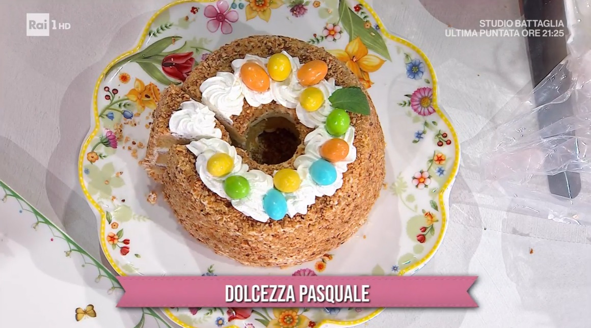 Montiamo la torta: alterniamo strati di pan di Spagna, su cui spalmiamo un velo di confettura di lamponi, un generoso strato di crema di ricotta, e ancora pan di Spagna, confettura e crema. Spalmiamo tutta la torta esternamente, con la crema rimasta, quindi facciamo aderire la granella di nocciole. Decoriamo, infine, con ciuffi di panna montata, ovetti e foglie di menta. La possiamo preparare fino a 2 giorni prima e conservarla in frigorifero.