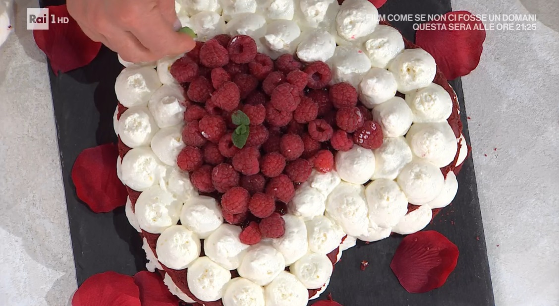 Prepariamo il pan di Spagna: con le fruste, montiamo le uova intere con lo zucchero e qualche goccia di colorante rosso. Dopo circa 10 minuti, ovvero quando l’impasto è chiaro e spumoso, aggiungiamo la farina setacciata insieme al cacao amaro, mescolando delicatamente con una spatola. Trasferiamo l’impasto in una tortiera imburrata a forma di cuore. Cuociamo in forno caldo e ventilato a 170° per 35 minuti.