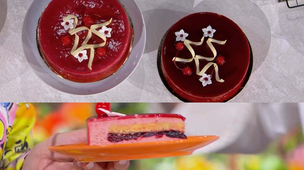 Puntata più breve, per via di una diretta dalla Camera dei Deputati, ma ugualmente ricca e golosa. Ad arricchire il menu di oggi c’è anche il dolce di Sal De Riso, che saluta il pubblico con una torta estiva, con un frutto di stagione. Ecco la torta fior di ciliegio.