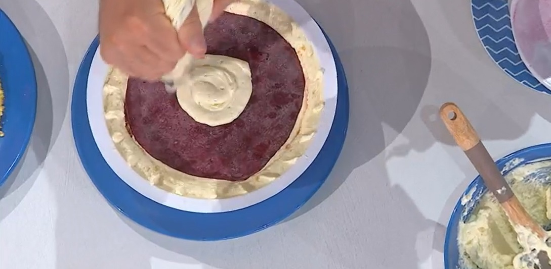 Componiamo: alla base di una tortiera, mettiamo il disco di pan di Spagna e lo inzuppiamo con la bagna al kirsh. Copriamo con uno strato di crema al cioccolato bianco, quindi sovrapponiamo l’inserto di ciliegie congelato e copriamo con un altro strato di crema. Finiamo con il secondo disco di pan di Spagna, che inzuppiamo per bene. Spalmiamo sopra un velo di crema, fino ad arrivare al bordo della tortiera. Congeliamo. Sformiamo la torta e la capovolgiamo. Spatoliamo la superficie con la panna montata e decoriamo a piacere con trucioli di cioccolato bianco e ciliegie sciroppate.