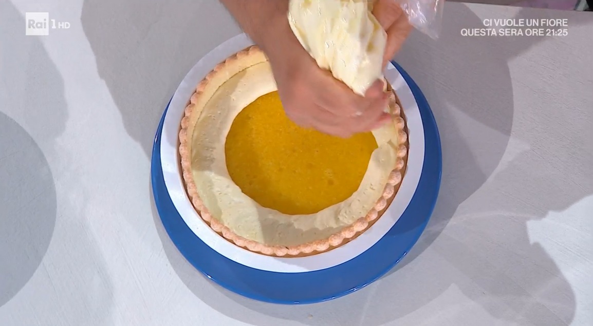 Per la crema, mescoliamo il mascarpone alla crema pasticcera già pronta e fredda. Uniamo la gelatina idratata in acqua e sciolta nella stessa, sul fuoco, e mescoliamo subito. Alleggeriamo la crema con la panna semi montata e zuccherata, che incorporiamo mescolando delicatamente.