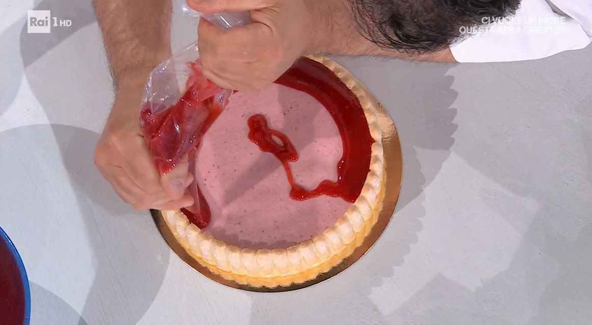 All’interno di una tortiera, posizioniamo un disco di pan di Spagna, che inzuppiamo con una bagna alle zagare, e sui bordi un giro di savoiardi. Formiamo sopra al pan di Spagna uno strato di crema al mascarpone. Distribuiamo sopra qualche fragola semi candita e sovrapponiamo un secondo disco di pan di Spagna. Versiamo sopra la crema di fragole, fino ad arrivare a mezzo cm dal bordo dei savoiardi. Congeliamo per qualche ora in freezer. Sformiamo e versiamo sopra la glassa di fragole ancora tiepida, fino ad arrivare al bordo dei savoiardi. Decoriamo a piacere e lasciamo scongelare in frigorifero prima di servire.