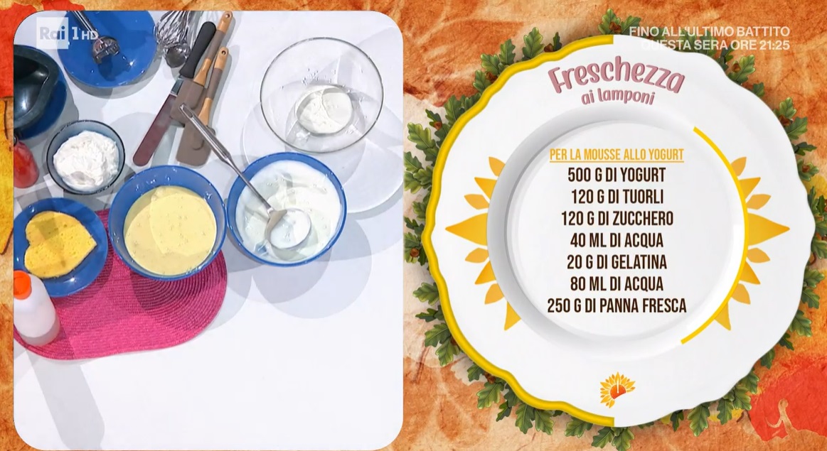 • Mousse: 500 g yogurt, 120 g tuorli, 120 g zucchero, 40 ml acqua, 20 g gelatina, 80 ml acqua, 250 g panna