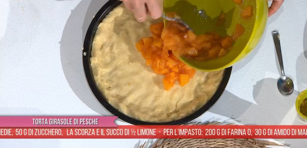 Imburriamo ed infariniamo una teglia, quindi ‘schiacciamo’ all’interno l’impasto preparato, creando mezzo cm di bordo (oppure lo stendiamo con il mattarello e trasferiamo il disco ottenuto all’interno della teglia). Distribuiamo sopra le pesche spadellate e cuociamo in forno caldo e statico a 180° per 25 minuti.