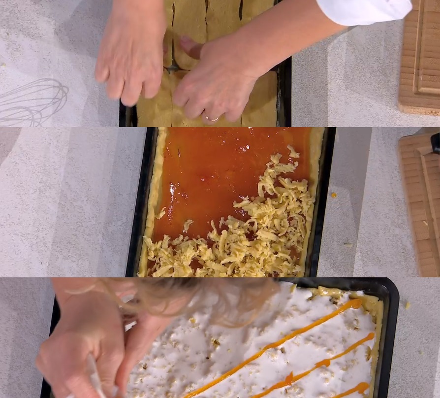 Nel caso non volessimo utilizzare il mattarello per stendere la frolla, la tagliamo a fette spesse circa 3-4 mm e usiamo le stesse per coprire il fondo ed i bordi di una tortiera imburrata e coperta con carta forno (le uniamo e le lisciamo schiacciando leggermente con un cucchiaio). In alternativa, stendiamo la frolla con il mattarello e la adagiamo all’interno della tortiera. Spalmiamo sulla frolla la confettura di albicocche e copriamo con la restante frolla grattugiata con una grattugia a fori grossi.