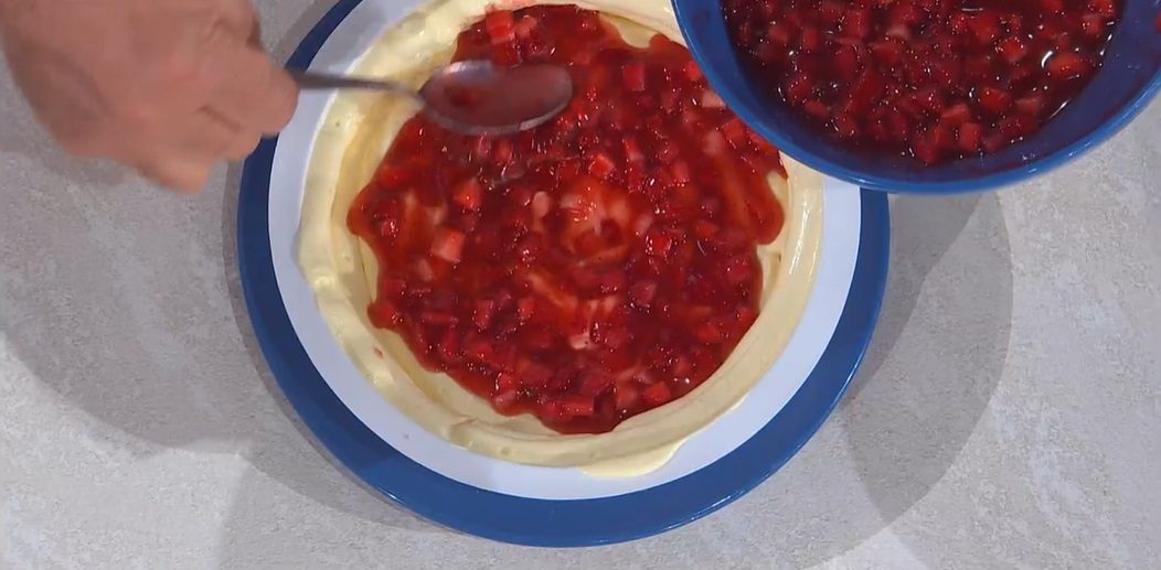 All’interno di una tortiera, inseriamo il disco di meringa sul fondo. Copriamo con uno strato di crema al mascarpone, che usiamo per coprire anche i bordi della tortiera. Distribuiamo sullo strato di crema le fragole marinate. Poggiamo sopra il pan di Spagna inzuppato e copriamo con un altro strato di crema, altre fragole e ancora un disco di pan di Spagna. Copriamo con della crema a filo della tortiera. Congeliamo e sformiamo la torta. La capovolgiamo e la decoriamo a piacere.