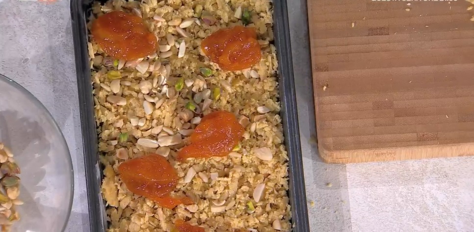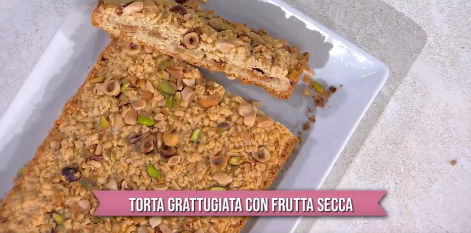 Seconda puntata in diretta di questo nuovo anno. Seconda occasione per ‘fare i bravi’ a tavola, con le ricette approvate da Evelina, come quella di Natalia Cattelani, che prepara uno dei suoi dolci, ma in una versione (leggermente) più salutare, utilizzando tanta frutta secca e della farina integrale. Ecco la torta grattugiata con frutta secca.