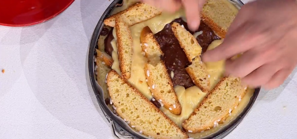 Distribuiamo sopra delle cucchiaiate di budino alla vaniglia e altre al cioccolato (ancora tiepido). Ancora uno strato di ciambella avanzata e di nuovo uvetta e i due budini. Ultimiamo con fette di ciambella romagnola. Chiudiamo con un foglio di carta forno, sopra un piatto e sopra ancora un peso. Mettiamo a raffreddare una notte nel frigorifero. Sformiamo il dolce e decoriamo con ciuffi di panna montata. Sopra spolveriamo con amaretti sbriciolati, ai lati attacchiamo degli amaretti interi.