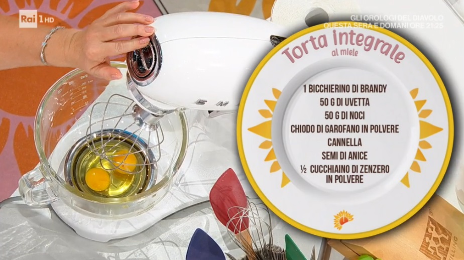 In planetaria, o in una ciotola, montiamo le uova intere con lo zucchero di canna, utilizzando le fruste elettriche. Ottenuto un composto chiaro e spumoso, uniamo l’olio evo a filo, mescolando ancora con le fruste, e successivamente il miele.