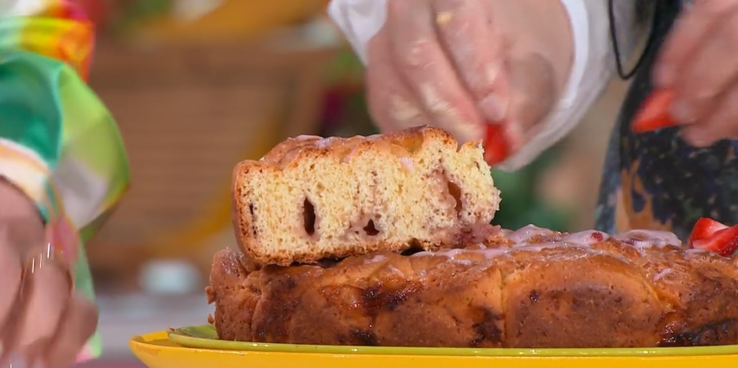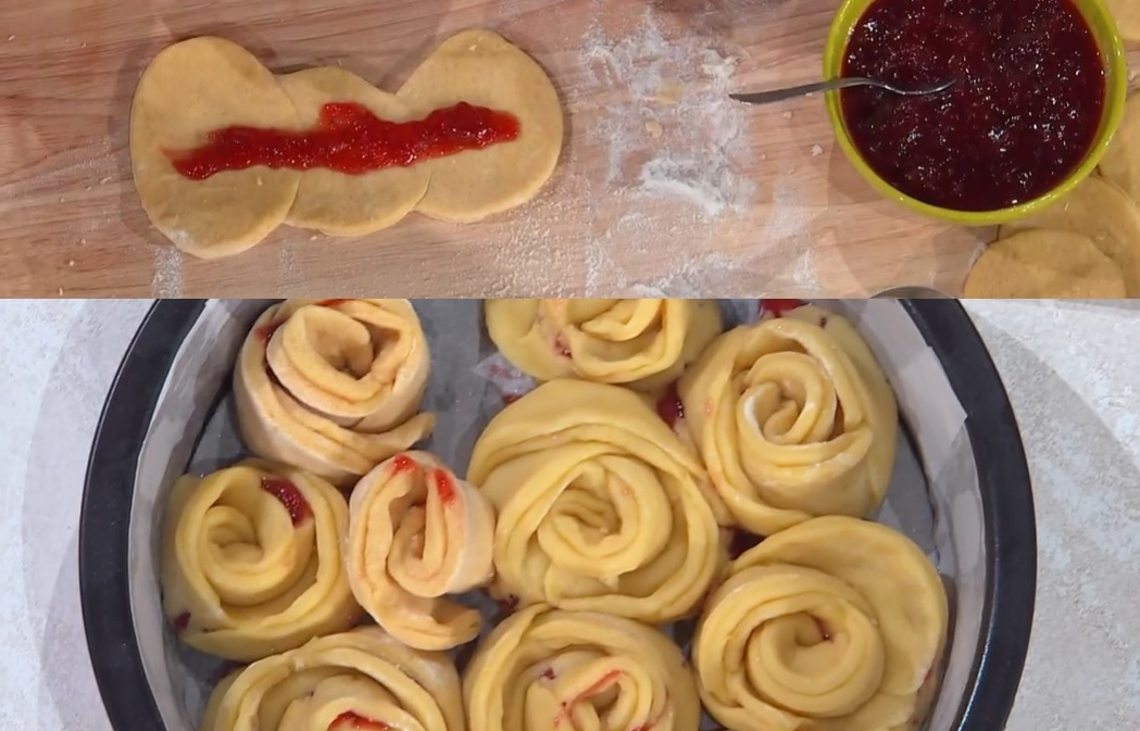 Disponiamo tre dischetti uno dietro l’altro, accavallandoli leggermente. Li appiattiamo leggermente al centro pressando col mattarello, quindi disponiamo un po’ di confettura al centro e ripieghiamo l’impasto sulla confettura, come fossero ravioli. Arrotoliamo il serpentello ottenuto su se stesso, a formare una chiocciola, o meglio, una rosa. Disponiamo quest’ultime all’interno di una tortiera da 26 cm di diametro. Spennelliamo la superficie con l’uovo sbattuto e cuociamo in forno caldo e statico a 180° per 45 minuti.