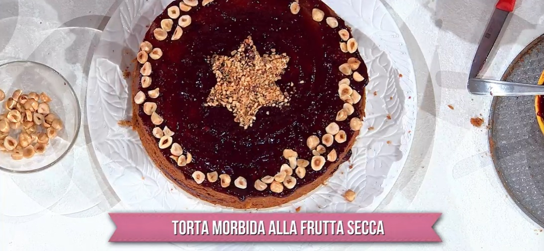 Tagliamo la torta a metà e la farciamo con la confettura di frutti di bosco. Spalmiamo la confettura anche sulla superficie della torta e decoriamo con granella di nocciole e nocciole intere.