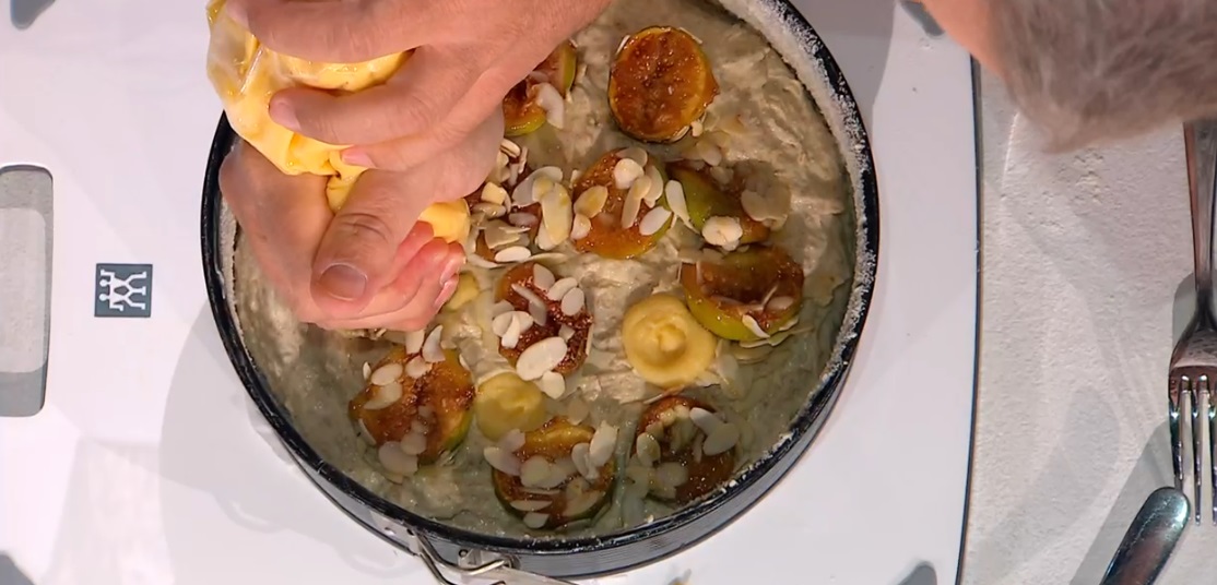 Trasferiamo l’impasto all’interno di una tortiera imburrata e spolverata con farina di mandorle. Lo livelliamo e disponiamo sopra i fichi con le mandorle a lamelle, alternandoli a ciuffi di crema pasticcera. Cuociamo la torta in forno caldo e statico a 170° per 40-45 minuti.