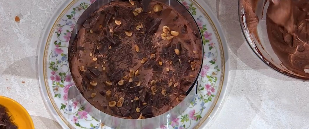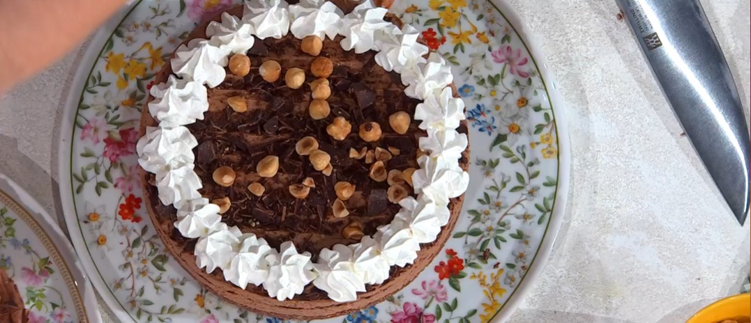 Mousse: facciamo sciogliere il cioccolato fondente. In una ciotola, mettiamo il mascarpone, la panna liquida e montiamo con le fruste elettriche. A parte, mescoliamo il formaggio spalmabile con lo zucchero a velo, quindi lo uniamo alla montata di mascarpone e panna e mescoliamo per bene. Aggiungiamo, infine, il cioccolato fuso e mescoliamo fino ad ottenere un composto omogeneo. Distribuiamo metà della crema sulla base, la livelliamo e distribuiamo sopra granella di nocciole e cioccolato tritato. Copriamo con la crema rimasta, livelliamo e decoriamo a piacere con panna montata. Facciamo rassodare in frigorifero. Possiamo anche congelarla e mangiarla come fosse un semifreddo (la teniamo mezz’ora a temperatura ambiente prima di consumarla).