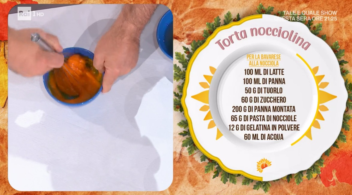 - Bavarese: 100 ml latte, 100 ml panna, 50 g tuorlo, 60 g zucchero, 200 g panna montata, 65 g pasta di nocciole, 12 g gelatina in polvere, 60 ml acqua