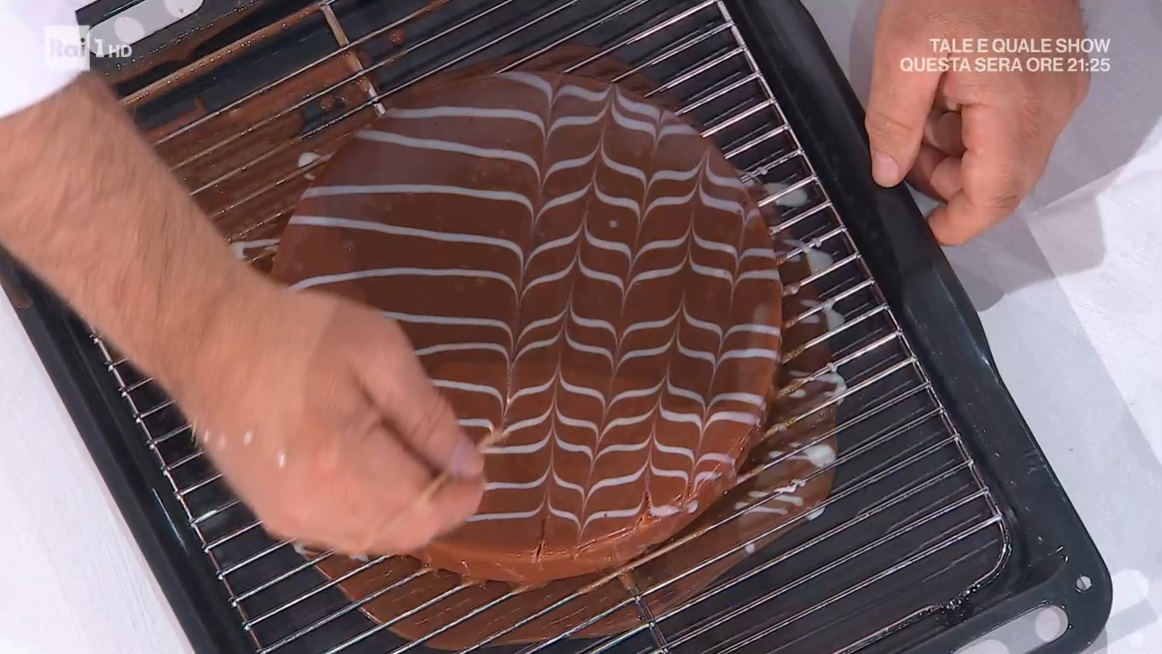 In una tortiera posizioniamo un disco di pan di Spagna alle nocciole alla base. Versiamo sopra un po’ di mousse al cioccolato. Inseriamo al centro l’inserto di croccante e mousse alla nocciola e copriamo con la restante mousse al cioccolato. Livelliamo e congeliamo. Sformiamo la torta e versiamo sopra la glassa a 35°.