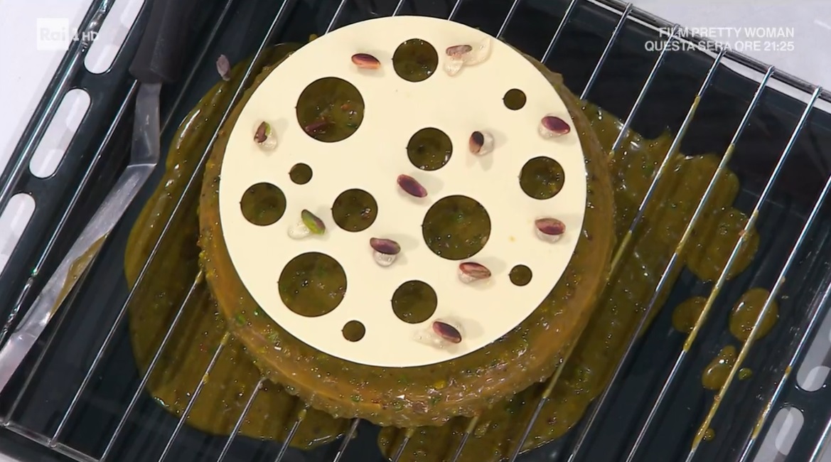 - Glassa: 130 ml latte, 40 g latte condensato, 32 g pasta di pistacchio, 50 g glucosio, 200 g cioccolato bianco, 6 g gelatina in polvere, 24 ml acqua, 40 g gelatina neutra, 40 g granella di pistacchio