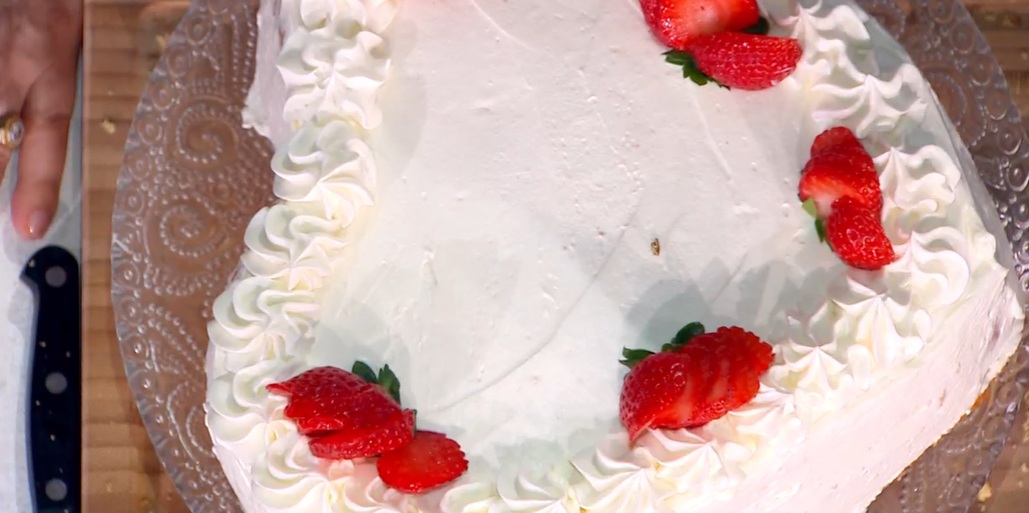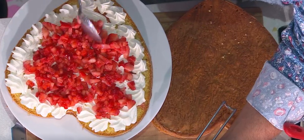 Tagliamo il pan di Spagna a forma di cuore in tre strati, bagniamo lo strato inferiore con il liquido delle fragole, quindi spalmiamo sopra uno strato generoso di crema e disponiamo sopra le fragole macerare e ben scolate. Sovrapponiamo il secondo strato di pan di Spagna e ripetiamo gli strati, con bagna, crema e fragole. Finiamo con l’ultimo disco di pan di Spagna. Spalmiamo la torta con la crema rimasta e la decoriamo a piacere.