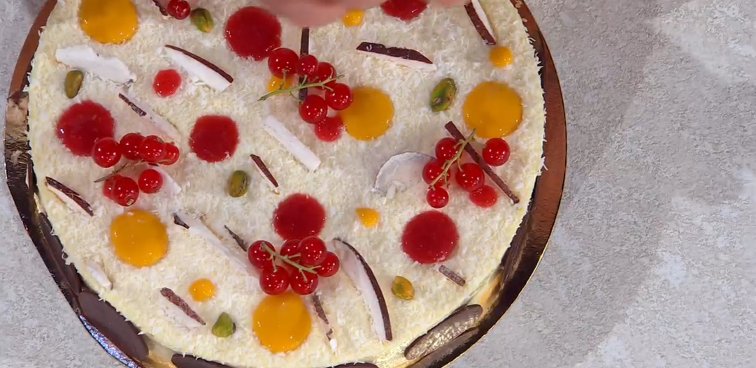 All’interno di una tortiera, posizionano un disco di pan di Spagna inzuppato con il rum e coliamo sopra circa metà della bavarese. Posizioniamo sopra l’inserto di gelatine congelate. Copriamo con la bavarese rimasta, spolveriamo con abbondante farina di cocco ed incastoniamo delle fettine di cocco. Congeliamo.
