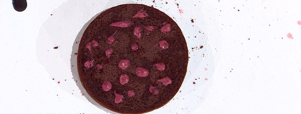 Lasciamo raffreddare il pan di Spagna e lo priviamo della ‘calotta’, la parte superiore, in modo da appiattirla. Tagliamo la torta a metà e la bagniamo con il succo di lampone. Con il manico di un mestolo, creiamo degli incavi sulle due metà e li riempiamo con la ganache al lampone. Ricongiungiamo le due metà e spalmiamo la ganache rimasta sulla superficie.