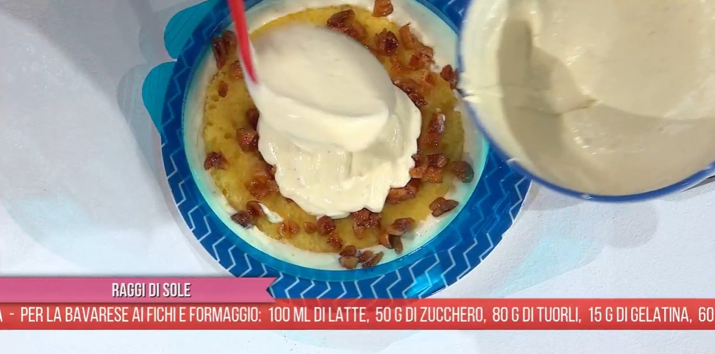 - Bavarese: 100 ml latte, 50 g zucchero, 80 g tuorli, 15 g gelatina, 60 ml acqua, 175 g polpa di fichi bianchi, 100 g formaggio spalmabile, 400 g panna semi montata, 40 g zucchero, 60 g fichi secchi