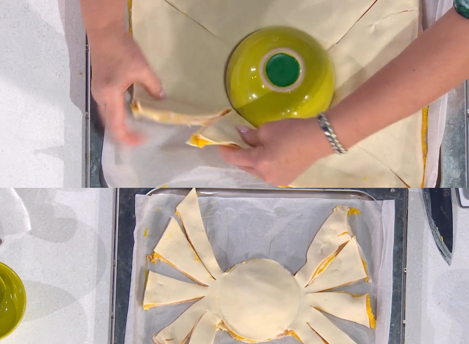 Una volta fredda, posizioniamo una ciotolina al centro, quindi con il coltello incidiamo ai 4 angoli. Eliminiamo due lati (da cui ricaviamo dei salatini). Le due parti rimaste, le tagliamo a striscioline, che distanziamo. Spennelliamo con tuorlo sbattuto con della panna e cuociamo in forno caldo a 190° per 20 minuti circa. All’uscita dal forno, facciamo gli occhi con dei chiodi di garofano.