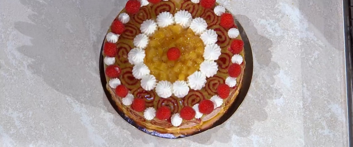 Coliamo la crema all’interno della tortiera foderata con le girelle di pan di Spagna. Adagiamo sopra un disco di pan di Spagna, che inzuppiamo con il succo d’ananas dolce. Congeliamo. Sformiamo la torta e la capovolgiamo. La lucidiamo spennellandola con della gelatina neutra. Decoriamo a piacere.