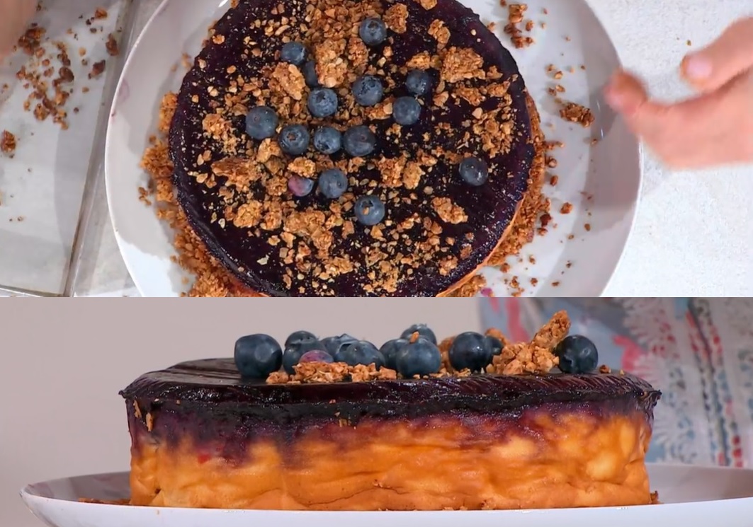 Versiamo la crema ottenuta sulla composta di mirtilli congelata e mettiamo in forno caldo e statico a 150° per 50 minuti. Lasciamo raffreddare con sopra un piatto.