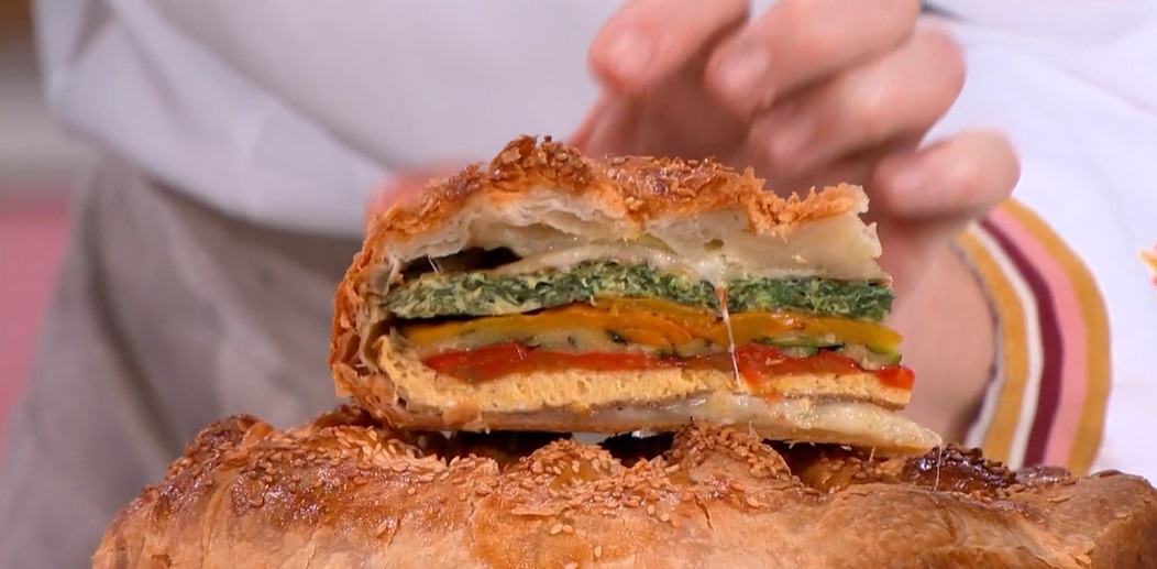 All’interno di una tortiera, stendiamo il rotolo di pasta sfoglia già pronta. Sul fondo, disponiamo le fette di fontina, sopra distribuiamo i peperoni grigliati, quindi adagiamo sopra la frittata semplice. Proseguiamo con lo zucchine grigliate e condite con olio, sale e menta, la seconda frittata (agli spinaci), i peperoni rimasti e finiamo con la fontina affettata. Ripieghiamo i lembi di sfoglia sul ripieno, li spennelliamo con l’uovo sbattuto e spolveriamo con i semi di sesamo. Cuociamo in forno caldo e statico a 180° per 45 minuti.