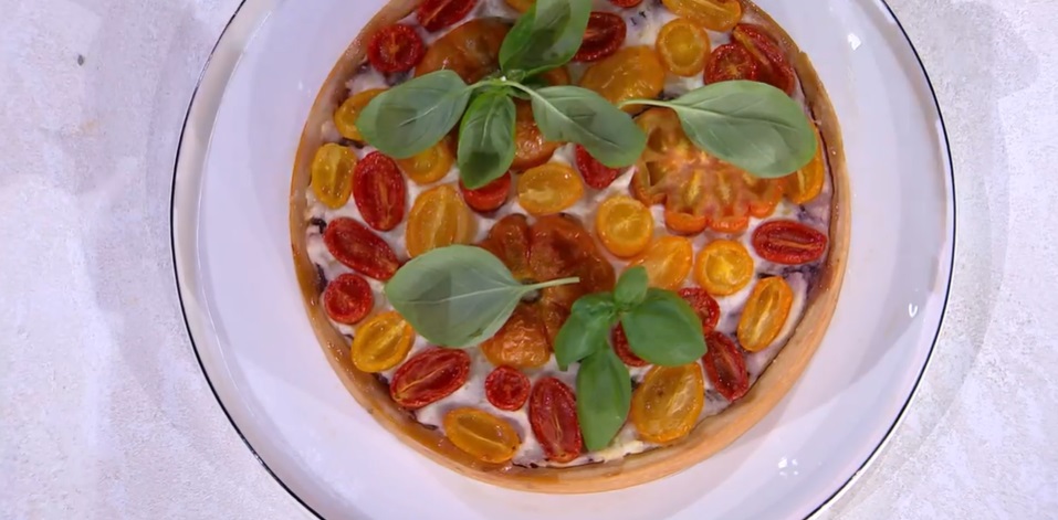 Mettiamo la farcia all’interno dell’involucro della torta, sopra distribuiamo la composta di cipolle e livelliamo bene. Mettiamo sopra i pomodori datterini gialli e rossi tagliati a metà, fettine di pomodori cuore di bue. Condiamo con sale e timo fresco e secco, un filo di olio e informiamo a 175⁰ per 35/40 minuti.