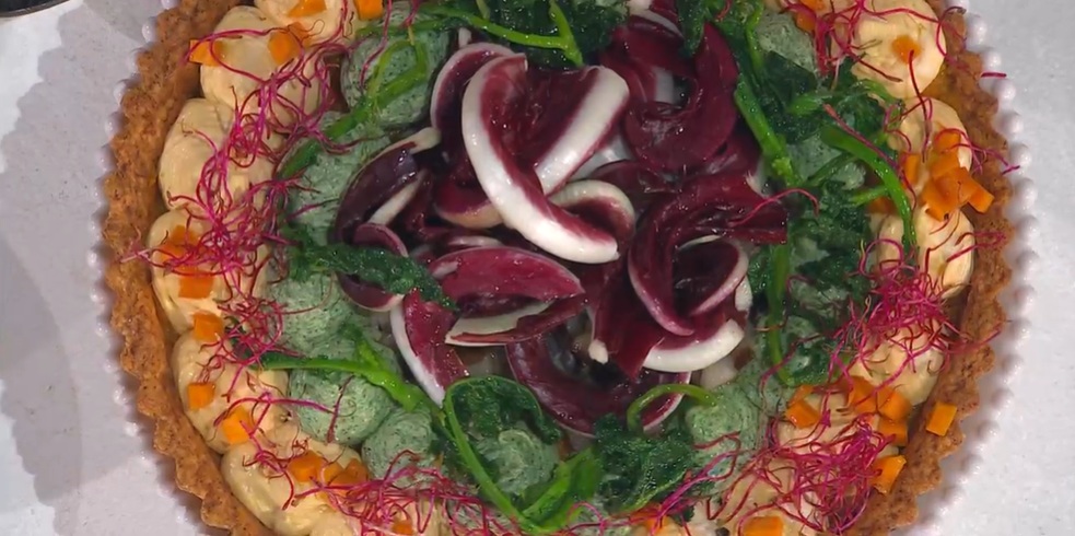 Condiamo la polpa di zucca rimasta con olio e sale e la spalmiamo alla base della crostata. Sopra, alterniamo ciuffi di crema di zucca e crema di cime di rapa. Al centro, mettiamo il radicchio spadellato. Decoriamo con le punte del radicchio crude, i cubetti di zucca spadellati, cime di rapa spadellate.
