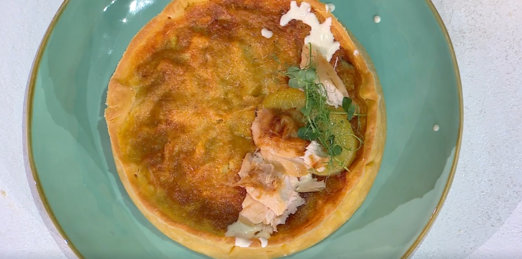 Stendiamo l’impasto, in modo da ottenere un disco. Lo posizioniamo all’interno di una tortiera e bucherelliamo il fondo. Disponiamo sopra le patate arrosto ed il pollo arrosto sfilacciato. Versiamo sopra la crema di mascarpone e cuociamo il tutto in forno caldo e statico a 180° per 50 minuti: la base dev’essere dorata.