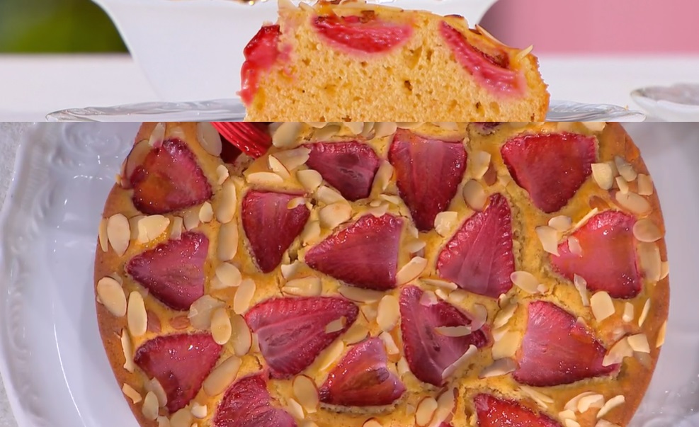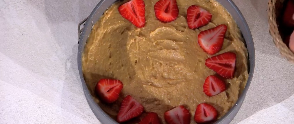 A questo punto, aggiungiamo la ricotta (possiamo sostituirla con formaggio spalmabile o yogurt greco) e mescoliamo con le fruste, unendo a filo anche l’olio di semi. Aggiungiamo quindi la farina setacciata con la fecola di patate e il lievito per dolci, mettiamo anche la farina integrale e continuiamo ad amalgamare con le fruste. Versiamo il composto in una tortiera foderata con carta forno e lo distribuiamo in modo omogeneo. Puliamo e tagliamo le fragole a metà, le distribuiamo sulla torta. Attorno alle fragole mettiamo delle lamelle di mandorla. Inforniamo a forno statico per 35/40 minuti a 180⁰. La lucidiamo spennellandola con confettura di fragole o albicocche.