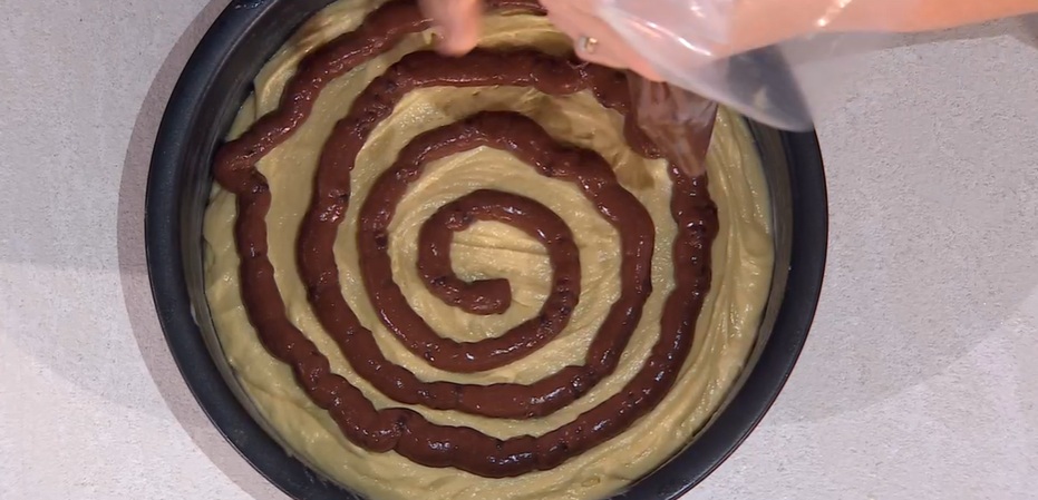 Ungiamo la tortiera con lo staccante (qui la ricetta) e versiamo all’interno l’impasto della torta. Livelliamo e, sopra, disegniamo una spirale con il budino (usiamo la sacca da pasticcere). Possiamo distribuirlo sopra a cucchiaiate.
