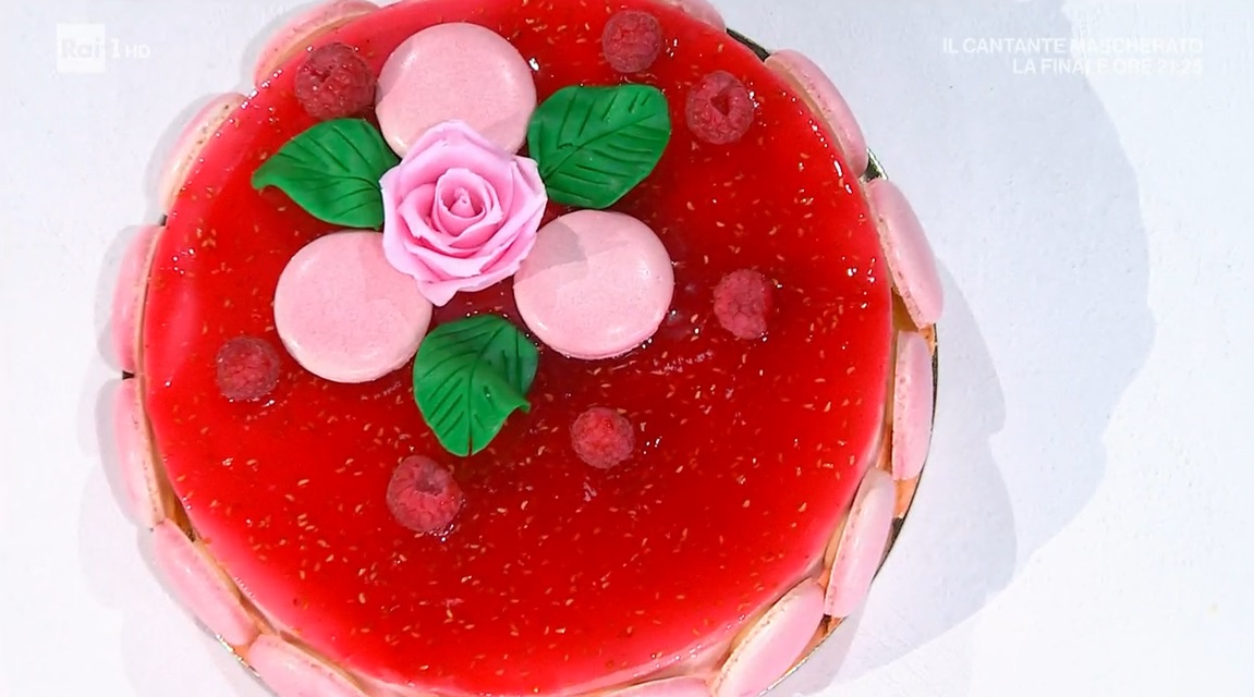 Gelatina: frulliamo i lamponi e li filtriamo. In una ciotola, mettiamo la polpa di lamponi, il succo di limone, lo zucchero e la gelatina sciolta nell’acqua (sul fuoco). Mescoliamo e versiamo all’interno di un anello del diametro della torta. Adagiamo sopra un disco di pan di Spagna, che inzuppiamo con una bagna alle rose. Congeliamo.