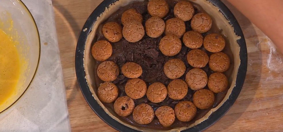Stendiamo il panetto in modo da creare un disco da inserire in una teglia per crostate, coprendo il fondo ed i bordi. Sul fondo, spalmiamo la confettura di castagne o marroni (si trova pronta al supermercato), disponiamo sopra del cioccolato tritato e gli amaretti secchi imbevuti nel cognac (o altro liquore). Versiamo sopra il composto di mandorle e lo livelliamo. Cuociamo in forno caldo e statico a 170° per 45 minuti.