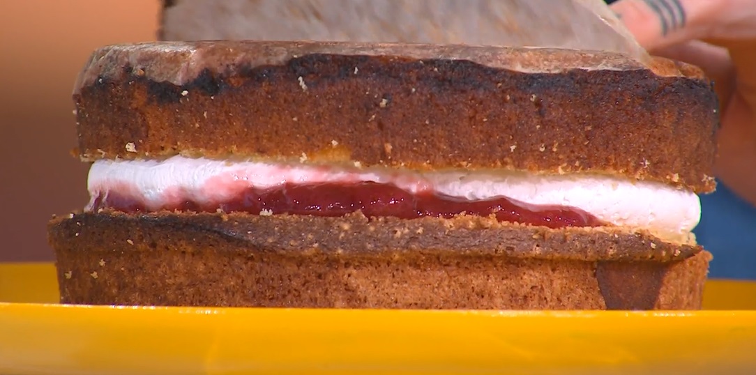 Lasciamo raffreddare il pan di Spagna e lo tagliamo a metà. Spalmiamo su una metà la confettura di fragole, che copriamo con un ricco strato di panna montata e zuccherata. Sovrapponiamo il secondo strato di pan di Spagna e finiamo con ciuffi di panne e fragole fresche.