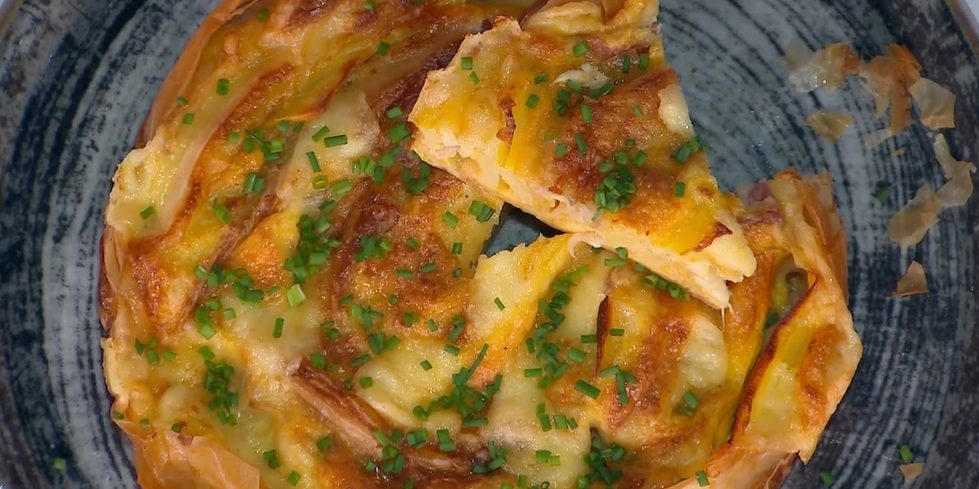 • 250 g pasta fillo, 200 g fontina, 150 g bacon, 3 patate lesse, 5 uova, 150 ml panna, 50 g formaggio grattugiato, erba cipollina, noce moscata, sale e pepe