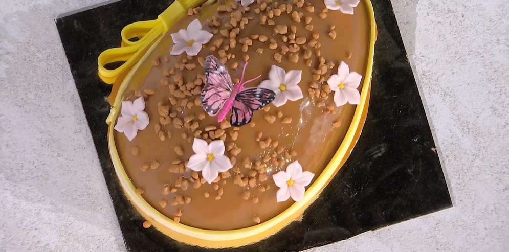 - Glassa: 40 ml acqua, 185 g zucchero, 115 ml panna, 60 g glucosio, 35 g latte condensato, 9 g gelatina, 36 ml acqua, 190 g glassa neutra, 225 g cioccolato al caramello