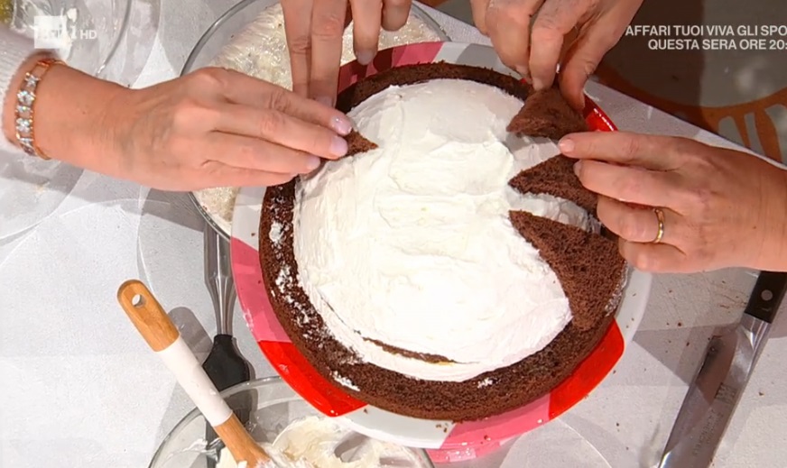Partiamo dall’impasto: mettiamo le uova intere in planetaria o in una ciotola ed aggiungiamo lo zucchero. Montiamo con le fruste elettriche per qualche minuto, fino ad ottenere un composto chiaro, spumoso e fermo. In una ciotolina, mescoliamo il burro a pomata con qualche cucchiaio di uova montate. Uniamo quest’ultimo composto alla montata di uova, mescolando delicatamente. Infine, incorporiamo la farina, il cacao ed il lievito setacciati insieme, mescolando delicatamente con una spatola. Trasferiamo il composto all’interno di una tortiera imburrata di 24 cm. Cuociamo in forno preriscaldato a 180°, statico, per 30 minuti; 170°, ventilato, stesso tempo. Una volta fredda, tagliamo la torta in 3 dischi.