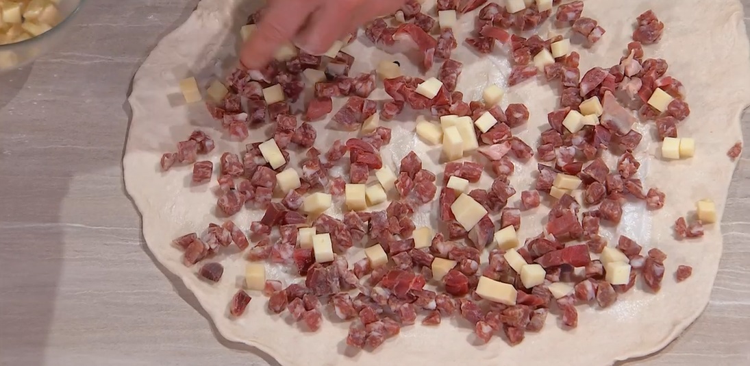 Allarghiamo ciascun panetto sul piano infarinato, in modo da ottenere un rettangolo sottile circa mezzo cm. Spalmiamo la superficie con un velo di strutto e distribuiamo sopra salumi e formaggi a dadini piccoli ed arrotoliamo l’impasto sul ripieno, a formare un salsicciotto. Inseriamo quest’ultimo all’interno dello stampo a ciambella ben unto di strutto. Copriamo e lasciamo lievitare per 3 ore a temperatura ambiente.