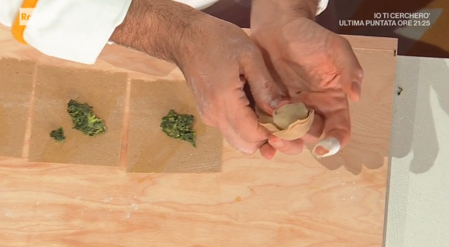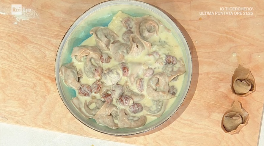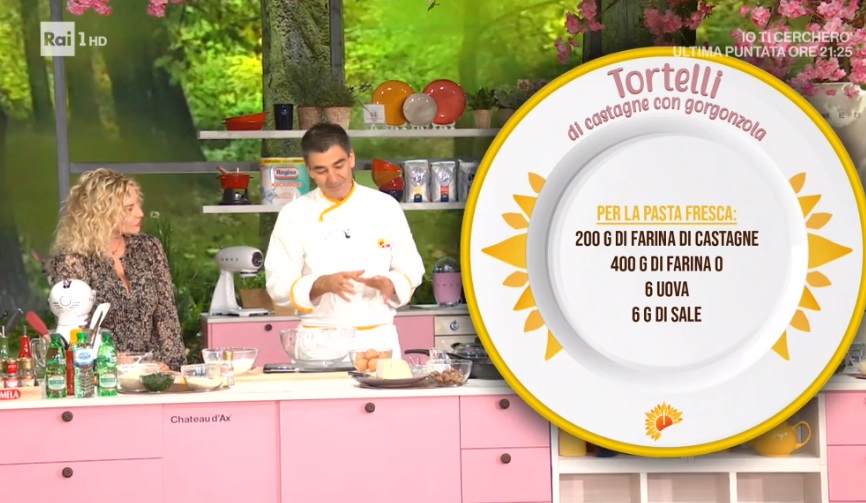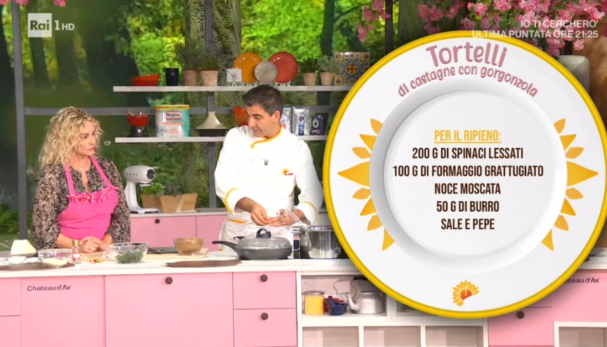 tortelli di castagne con gorgonzolaSergio Barzetti arriva a sorpresa nella cucina di Rai1 con un cesto colmo di uova fresche, ‘prodotte’ dalla sua gallina. Le uova sono l’ingrediente principale del primo piatto di Sergio, i tortelli di castagne con gorgonzola.