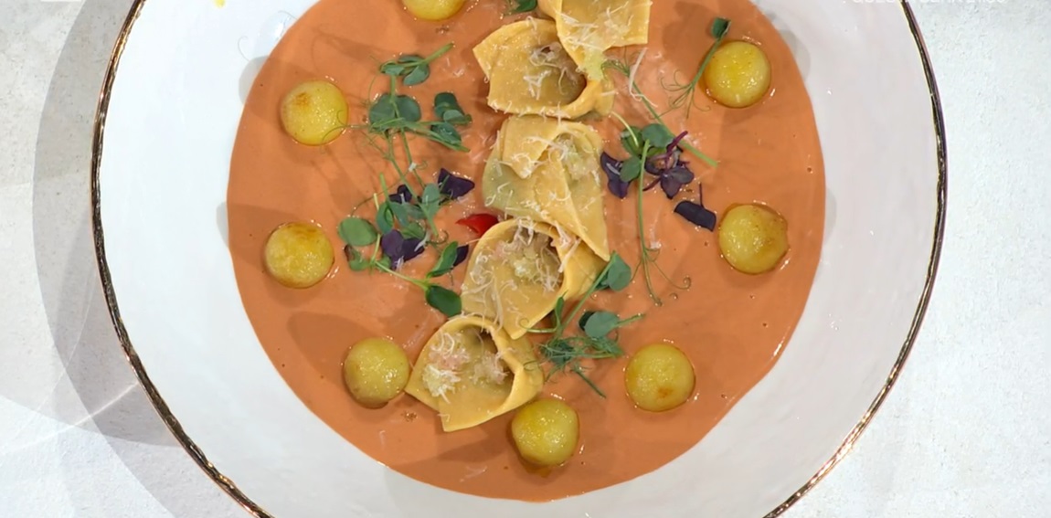 Scoliamo i tortelli, li condiamo con poco olio. Li serviamo su un letto di bisque arricchita con la panna. Completiamo con gli scampi spadellati, le patate al curry, fonduta di pecorino ed il finger lime.