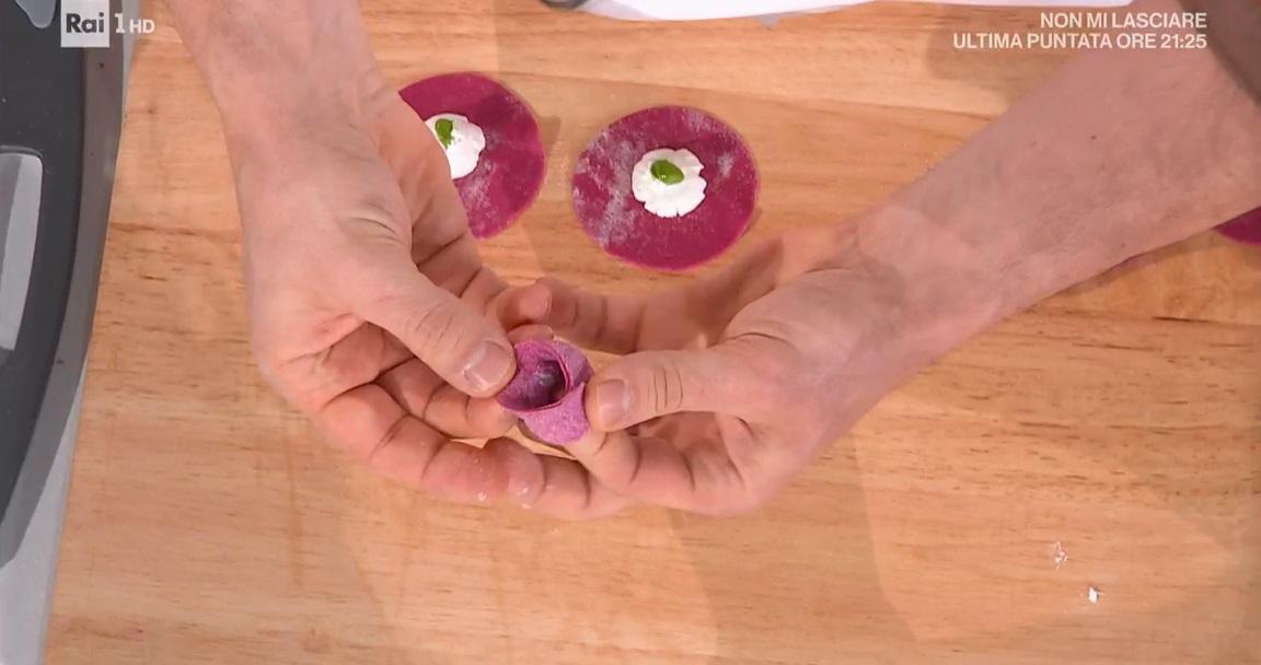 Prepariamo la pasta: frulliamo le uova con la rapa rossa precotta. Lavoriamo la farina con la scorza di limone grattugiata e la crema di rapa, fino ad ottenere un panetto omogeneo. Avvolgiamo nella pellicola e lasciamo riposare per almeno mezz’ora.