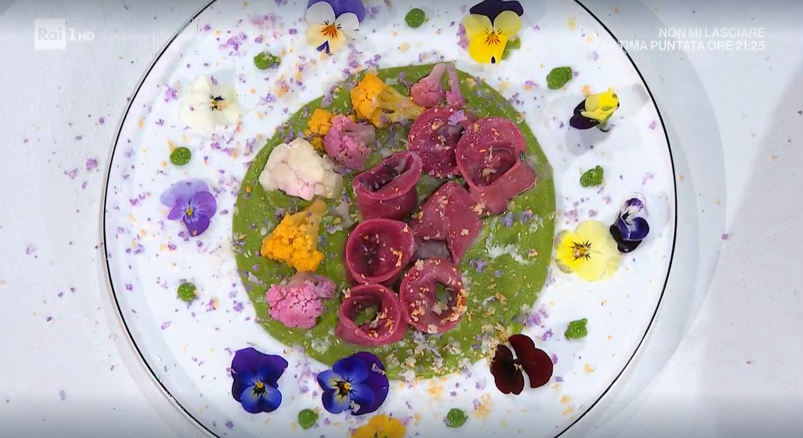 Serviamo i tortelli su uno specchio di crema di piselli insieme ai broccoli saltati ed i fiori eduli. Finiamo con il pecorino grattugiato.
