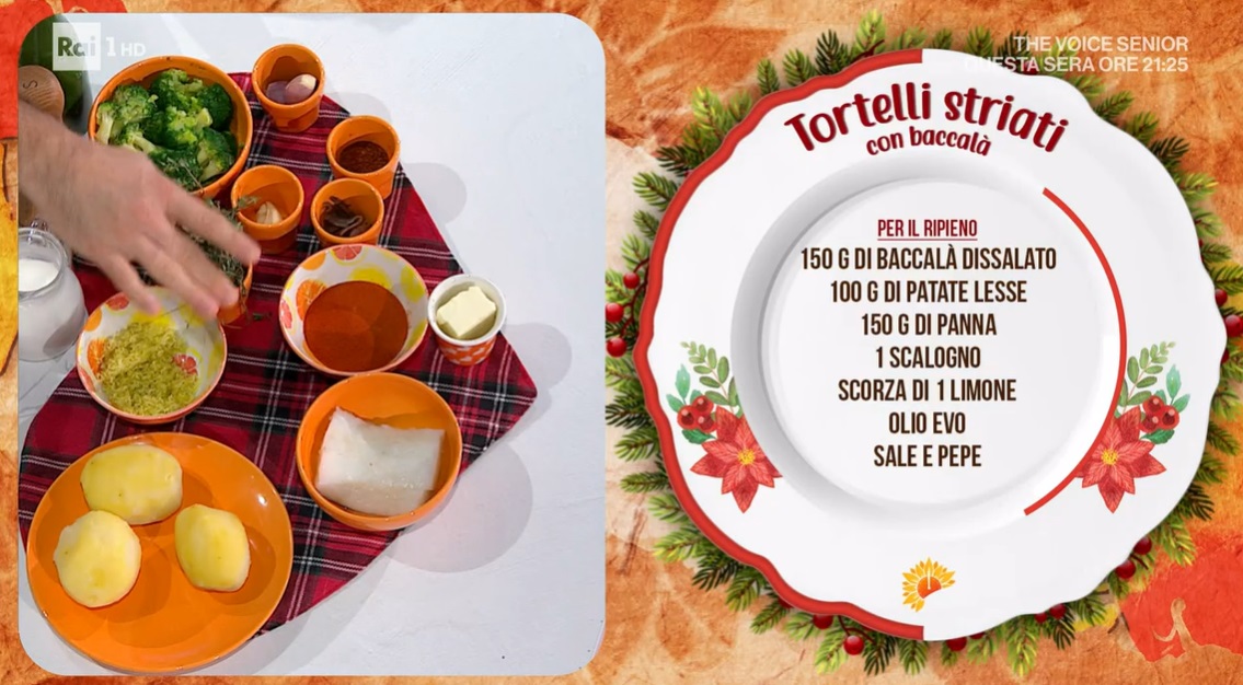 La Sicilia torna protagonista nel mezzogiorno di Rai1, con Fabio Potenzano. Il cuoco palermitano, in vista delle feste, si cimenta nella preparazione di un primo piatto di pesce, dall’aspetto e dal gusto raffinati e ricercati. Vediamo come prepare i tortelli striati con baccalà.