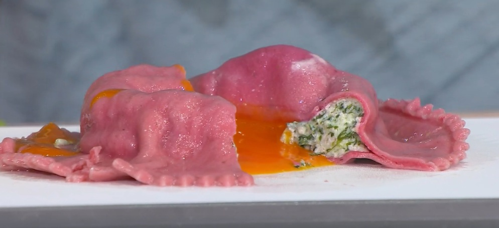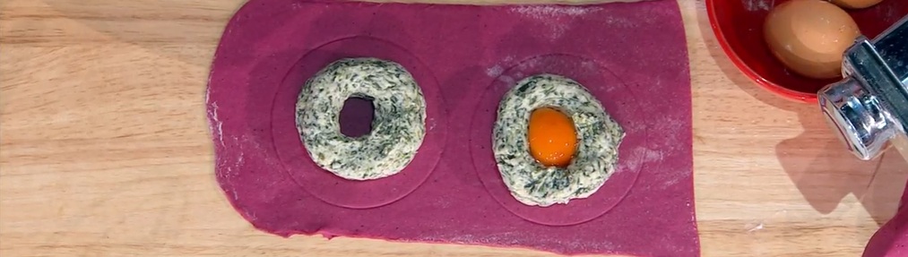 Sfoglia: impastiamo la farina con la purea di barbabietola e un uovo (possiamo frullare l’uovo con la barbabietola precotta). Lasciamo riposare il panetto ottenuto per mezz’ora, avvolto nella pellicola trasparente, poi la tiriamo col mattarello o la sfogliatrice. Ne ricaviamo dei dischetti con un coppapasta grande, oppure usando un piattino da caffè.